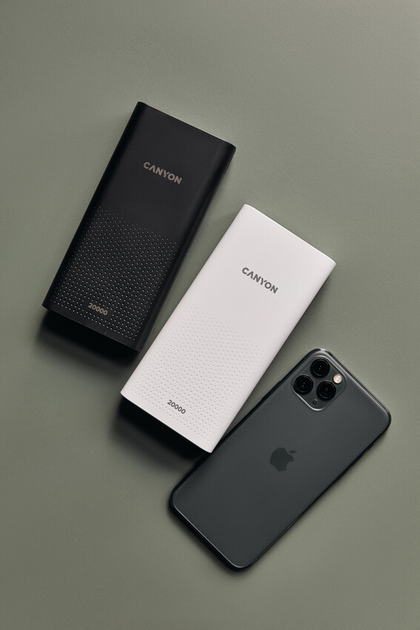 Кожен користувач гаджетів стикався з проблемою - смартфон або навушники розряджаються на найцікавішому місці серіалу, гри або гарячого діалогу в чаті! Щоб ви могли користуватися мобільним пристроєм протягом усього дня, не побоюючись про розрядженою батареї, Canyon випустив модель акумулятора PB-2001. Її відрізняє максимальна ємність при досить компактному розмірі, а також 2 зарядних входи - Micro-USB і Type-C. Акумулятор заряджає 2 пристрої одночасно через вихід USB-A. Крім того, павербанк забезпечений шістьма типами захисту та уміщений в стильний темно-графітовий або білий корпус. Максимум продуктивності і мінімум місця у вашій сумці!