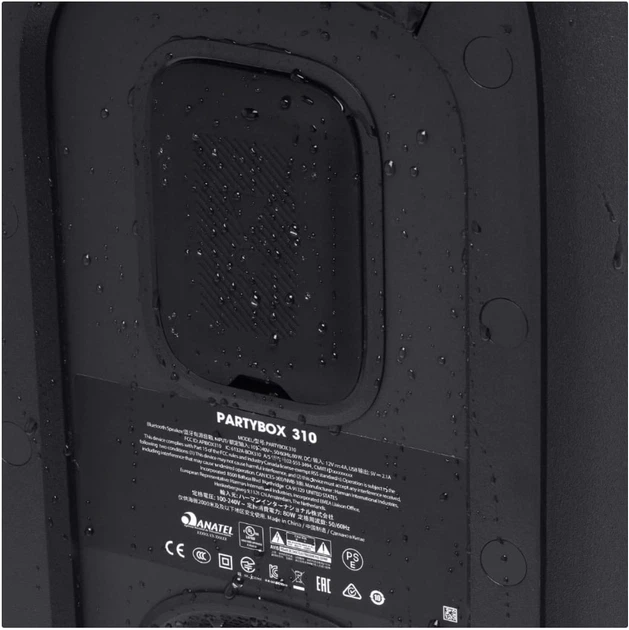 Рівень вологозахисту IPX4 дозволяє використовувати колонку JBL PartyBox 310 в умовах, коли можливий контакт з водою. Бризки напоїв, несподівана зміна погоди — не привід зупиняти музику.