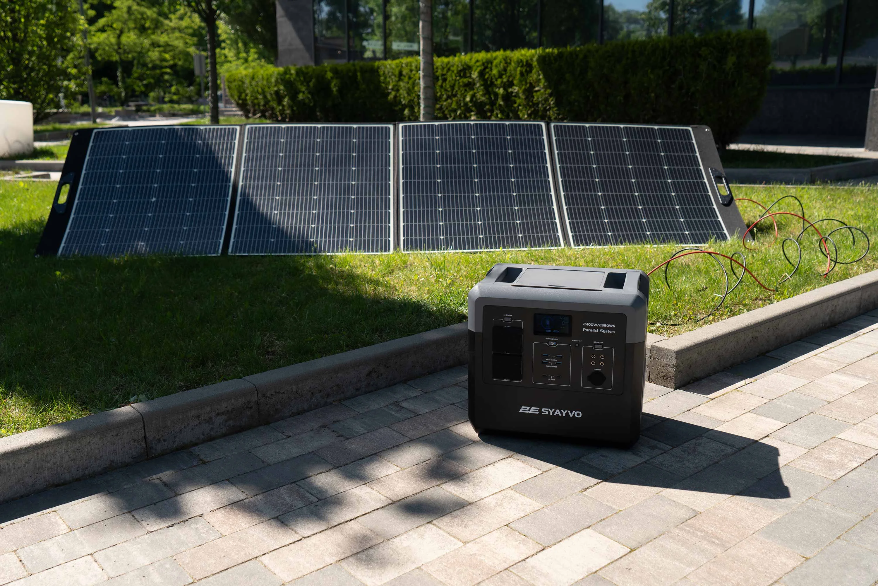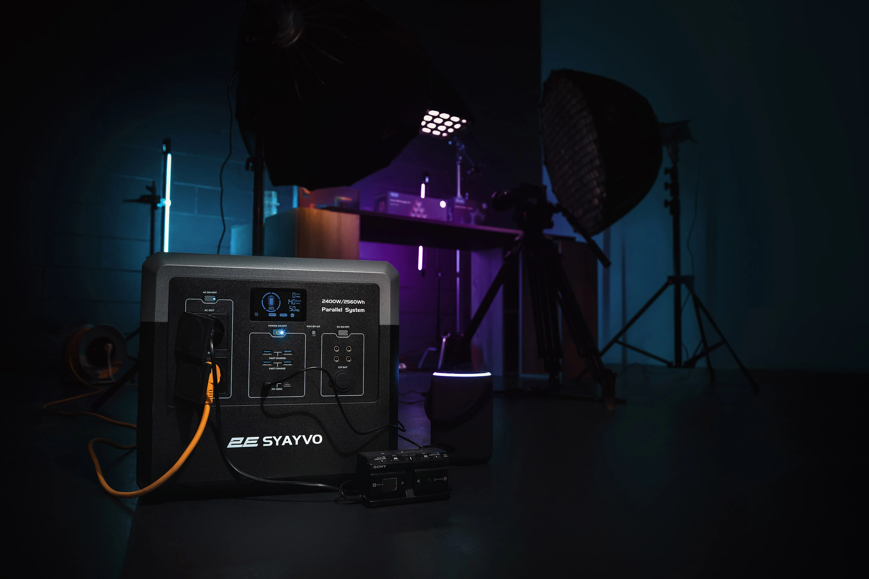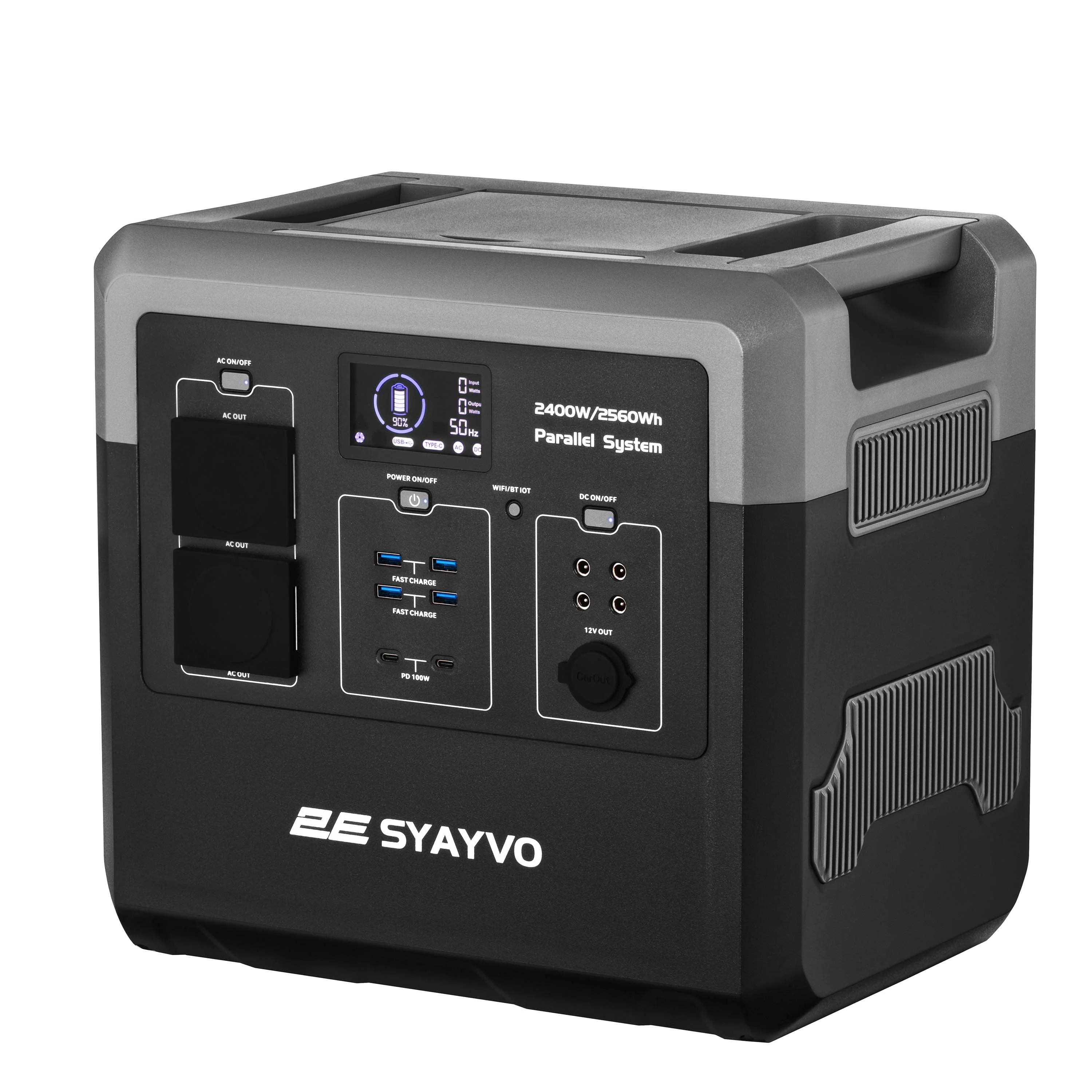 Інноваційна та надпотужна портативна зарядна станція 2E SYAYVO нового покоління з номінальною потужністю інвертора 2 400 Вт (3 000 Вт пікова) і ємністю акумулятора LiFePO4 2560 Вт·год. Однією з найбільш значущих особливостей моделі є інноваційна система паралельного з’єднання 2E Parallel System.