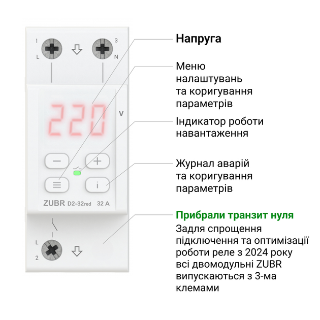 ZUBR D2 red має дуже зручне стандартизоване підключення вхід-вихід. Налаштування роботи пристрою здійснюється за допомогою лише трьох кнопок. Четверна кнопка «i» призначена для перегляду журналу аварійних спрацьовувань та розшифровки абревіатур пунктів меню. Цифровий екран постійно відображає значення напруги та виводить системну інформацію. У режимі очікування можна налаштувати яскравість екрана та індикатора.